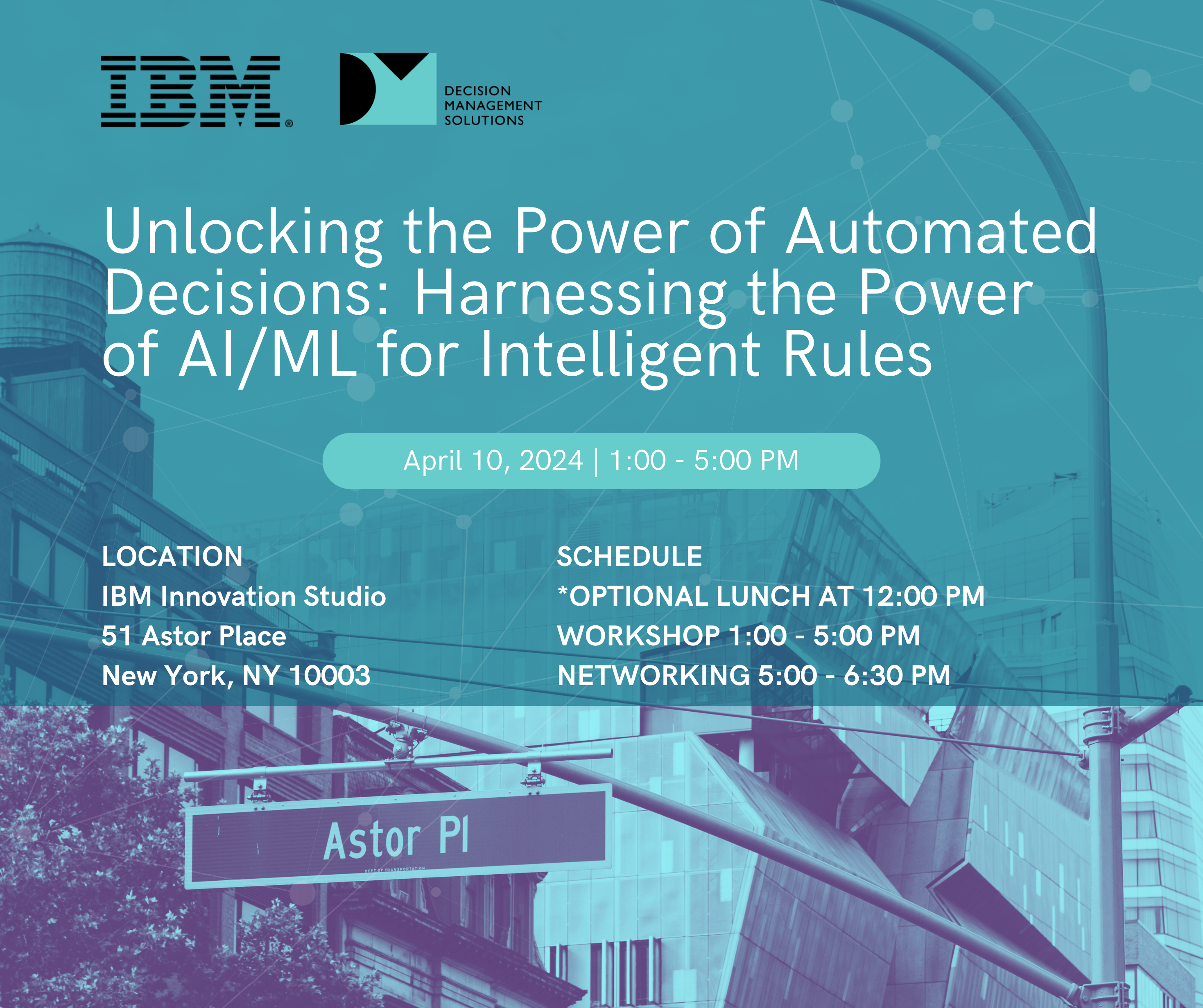 We hope you can join us in person, we will be offering a networking lunch prior to the start of the workshop and after the event we will continue the conversation at a happy hour with our IBM and Decision Management Solutions experts.